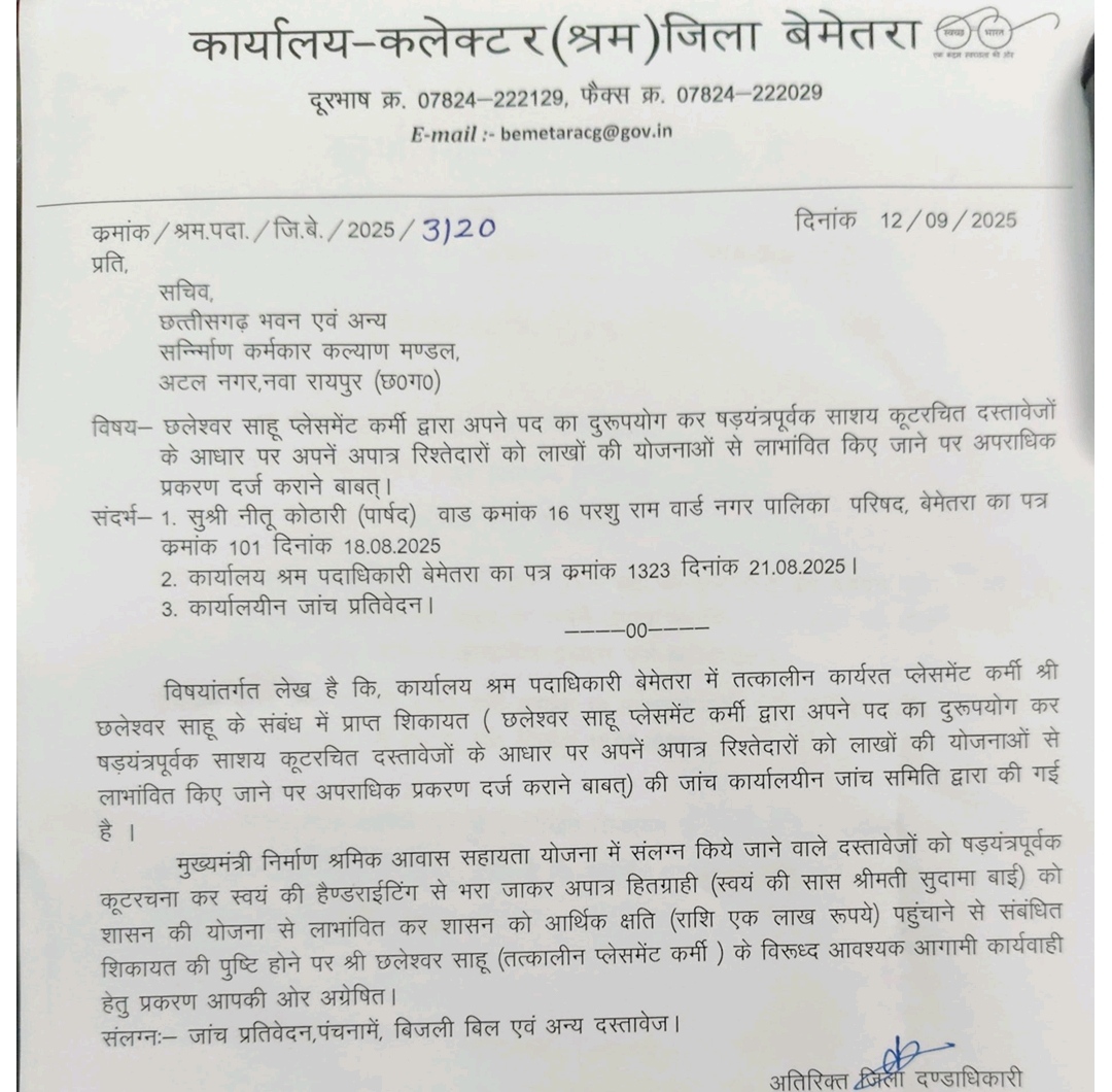कार्यालयीन जांच समिति ने पाया कि तत्कालीन प्लेसमेंट कर्मी छलेश्वर साहू ने मुख्यमंत्री निर्माण श्रमिक आवास सहायता योजना के तहत प्रस्तुत दस्तावेजों में हेराफेरी की। योजनाओं में लाभार्थी दिखाए गए दस्तावेज झूठे और कूट रचित पाए गए।