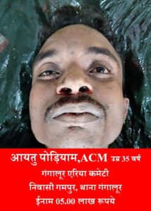 *1. आयतु पोड़ियाम, उम्र 35 वर्ष निवासी गमपुर थाना गंगालूर जिला बीजापुर, पदनाम-एसीएम, गंगालूर एरिया कमेटी, ईनाम 05.00 लाख रूपये*