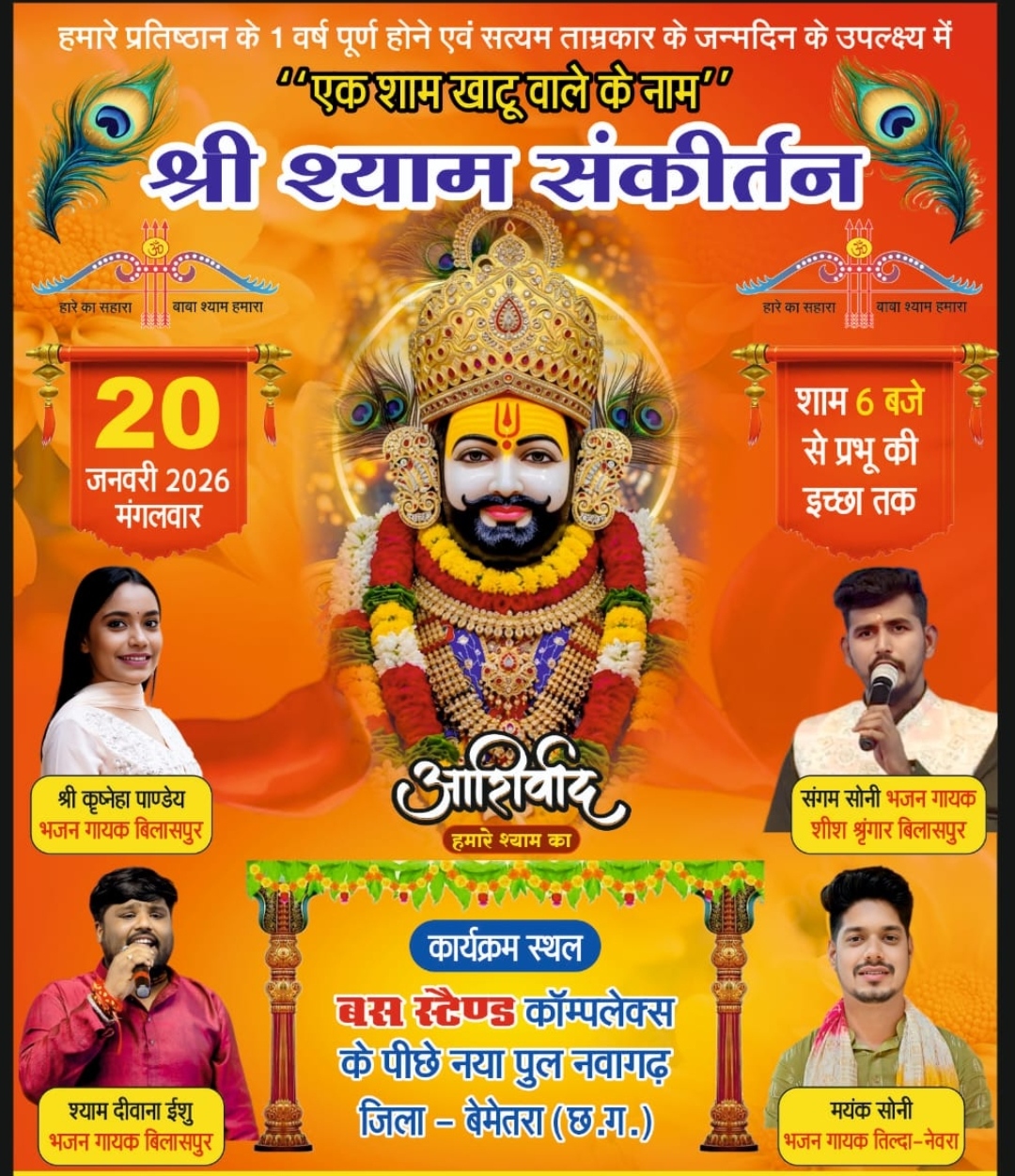 नवागढ़ (ट्रैक सीजी/हेमंत सिन्हा)। श्री अनमोल बर्तन इलेक्ट्रॉनिक एवं फर्नीचर दुकान के एक वर्ष पूर्ण होने तथा सत्यम ताम्रकार के जन्मदिन के उपलक्ष्य में नगर नवागढ़ में 20 जनवरी को भव्य खाटू श्याम भजन संध्या का आयोजन किया जा रहा है। कार्यक्रम स्थल बस स्टैंड गौरव पथ कॉम्पलेक्स के पीछे नया पुल परिसर निर्धारित किया गया है, जहां संपूर्ण क्षेत्र श्याम भक्ति के रंग में रंगने वाला है।
